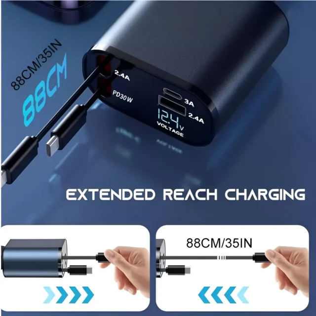 This car charger isn’t just a charging accessory—it’s a game changer. With its tangle-free retractable cables, you can say goodbye to messy wires in your car. The compact size and adjustable body make it easy to use in any vehicle. Plus, its ability to support multiple devices ensures you’ll never have to choose which device gets charged first.