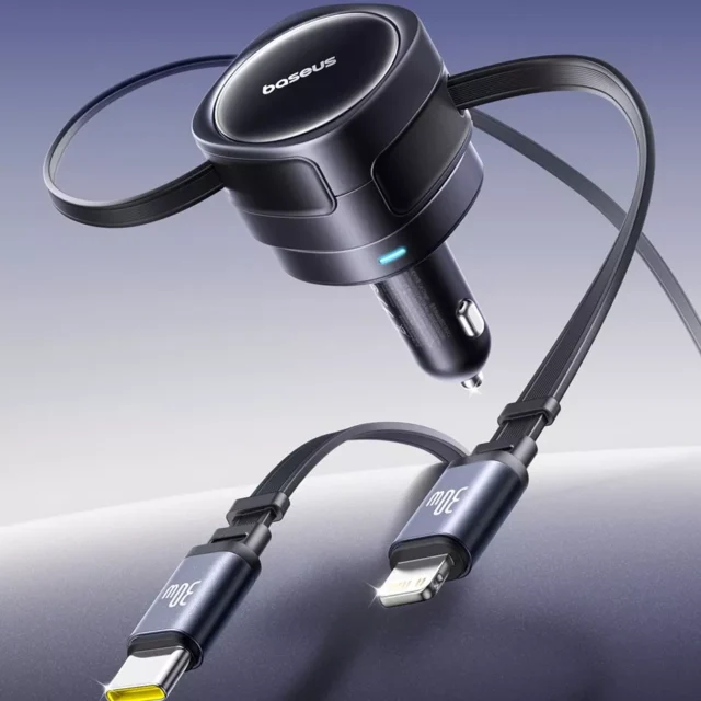 This compact charger plugs effortlessly into your car’s lighter slot, giving you two powerful USB outputs to charge multiple devices at once. Its retractable cable system allows you to keep your car organized while ensuring that the cables never get tangled. Whether you’re charging your iPhone, tablet, or other USB-powered devices, this charger has you covered with up to 90W of output power, delivering a fast and reliable charge every time.
