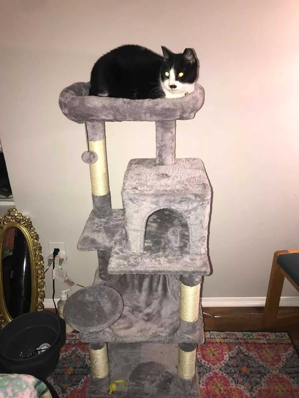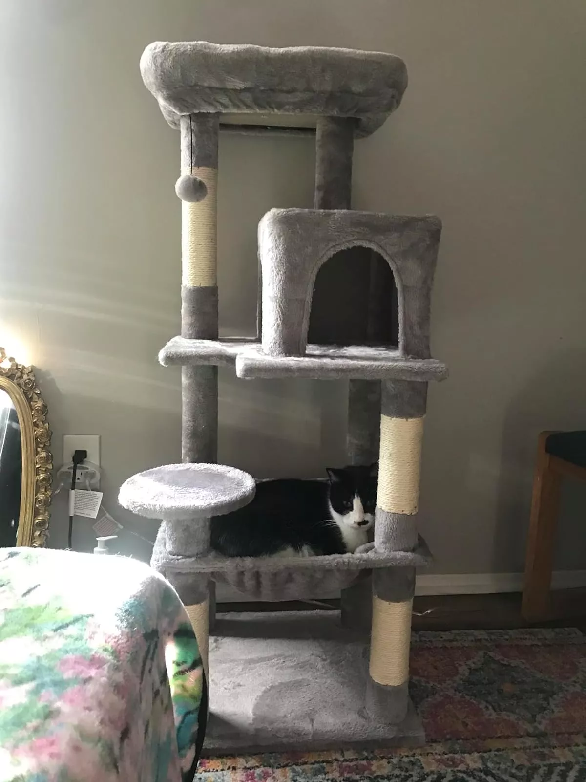I purchased this for my cat in the hopes that he would sleep on/in it and also use it as a scratching post. After a little exploration (assisted with some cat treats) he likes using it for his daily naps, however he doesn't seem to really like using it as a scratching post at all, so I can't really comment on its lasting power as a scratching post. Putting this together is pretty simple and most of your time will be spent finding and retrieving the specific pieces needed for a piece. Even with my boyfriend assisting this took us about twenty minutes to set up. All of the pieces are included, which was also pretty handy. Overall I'm very pleased with this. My cat is pretty happy with it and it's a big deal for me. I definitely don't regret purchasing this.
