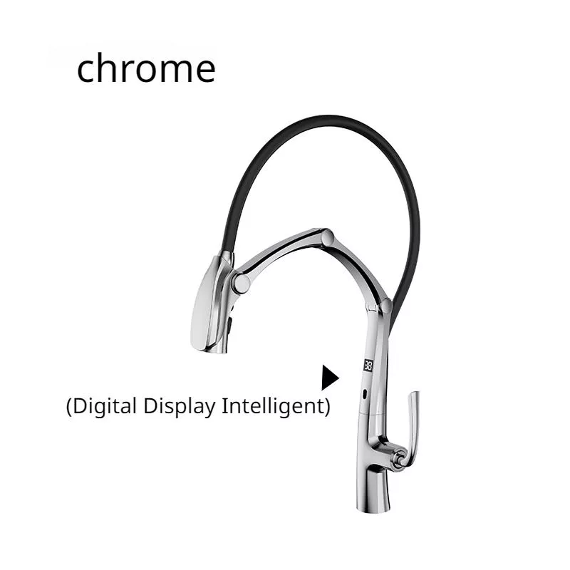 Our kitchen faucet stands out for its blend of contemporary style and cutting-edge technology. The digital display provides precise control over water temperature and flow, enhancing both safety and convenience. The intelligent induction feature allows for hands-free operation, making it perfect for moments when your hands are full or messy. The magnetic suction ensures the spray head is always securely in place, while the retractable design offers the flexibility to tackle any kitchen task with ease.